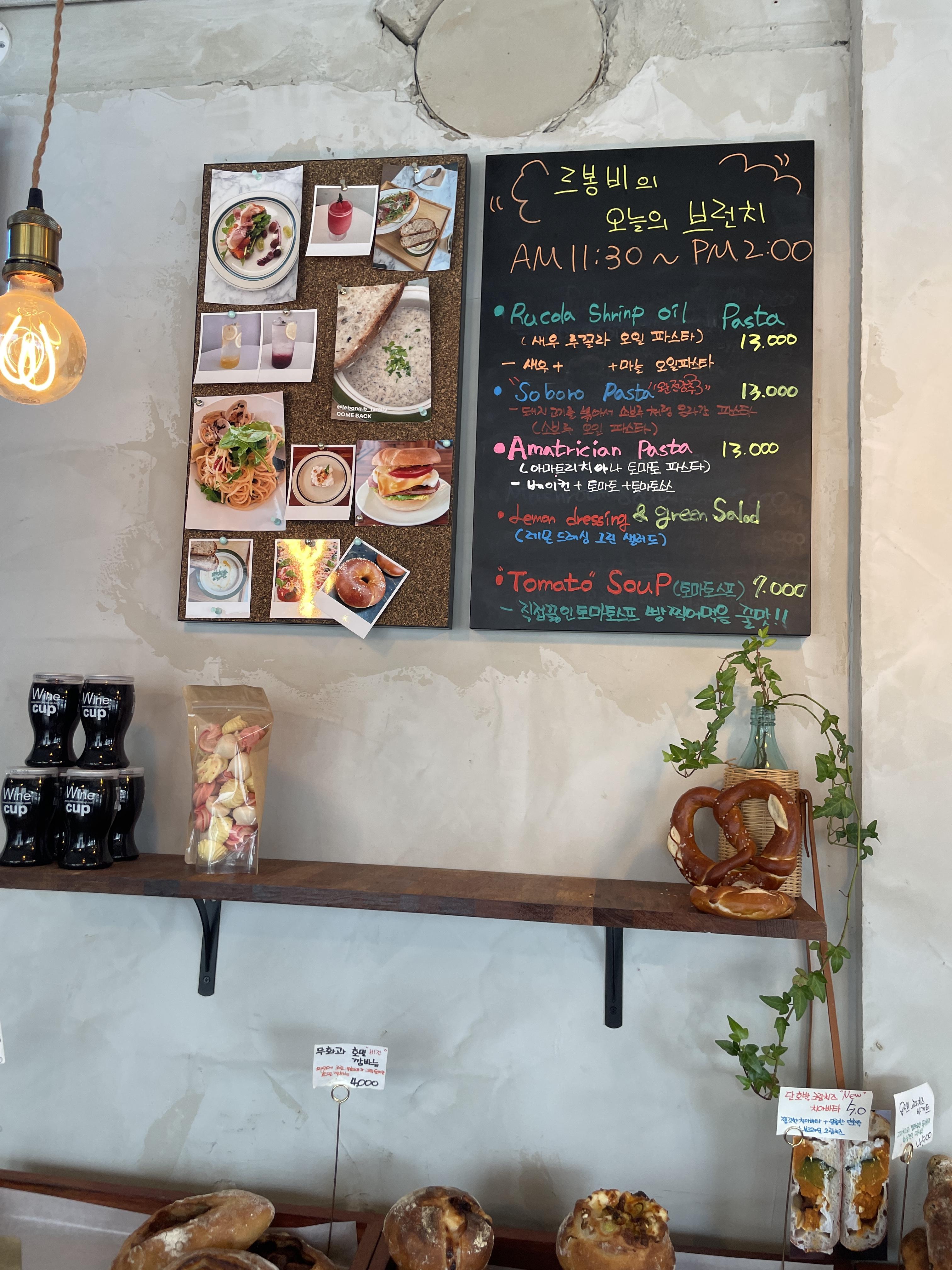 빵은 각각 메뉴명과 가격이 붙여져 있고, 카페 메뉴와 브런치 메뉴판은 분리되어 있습니다.