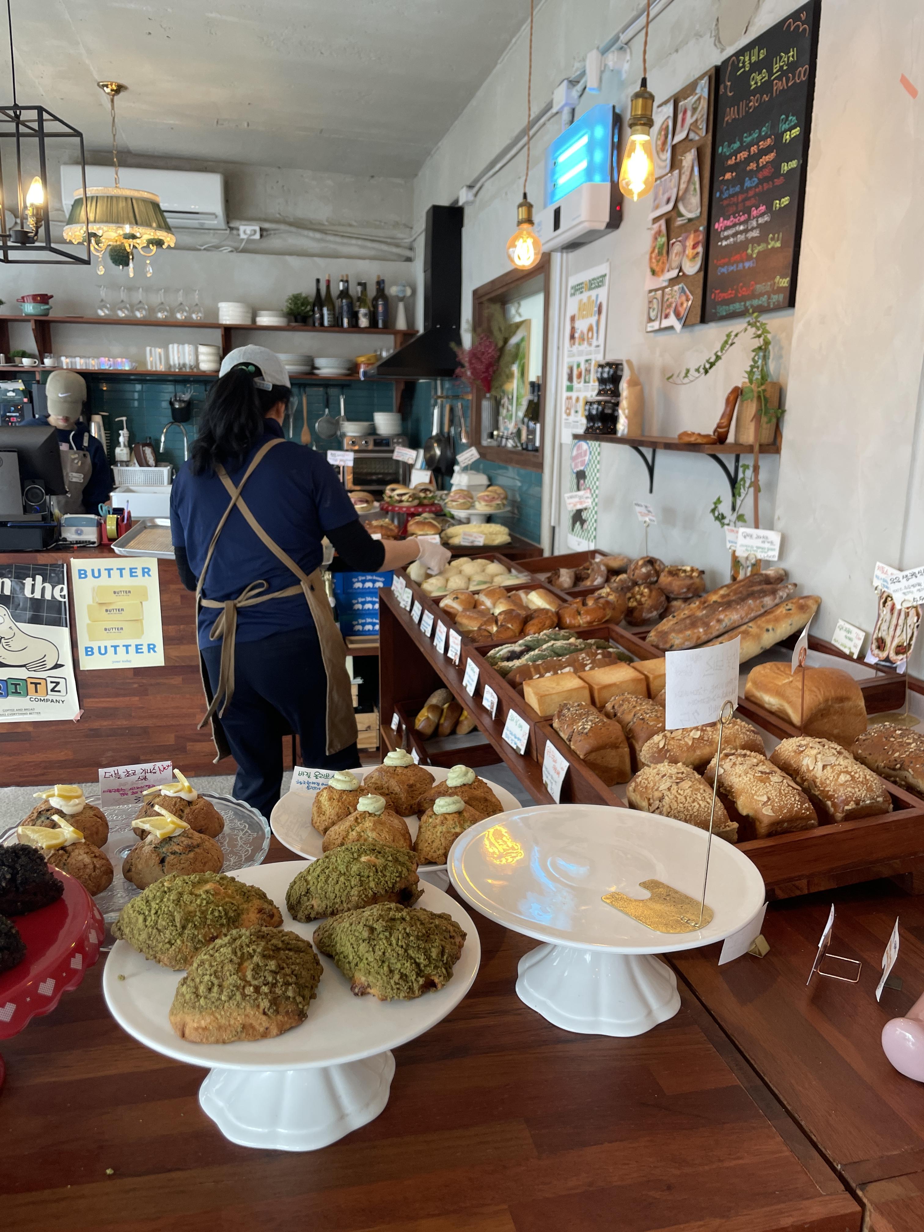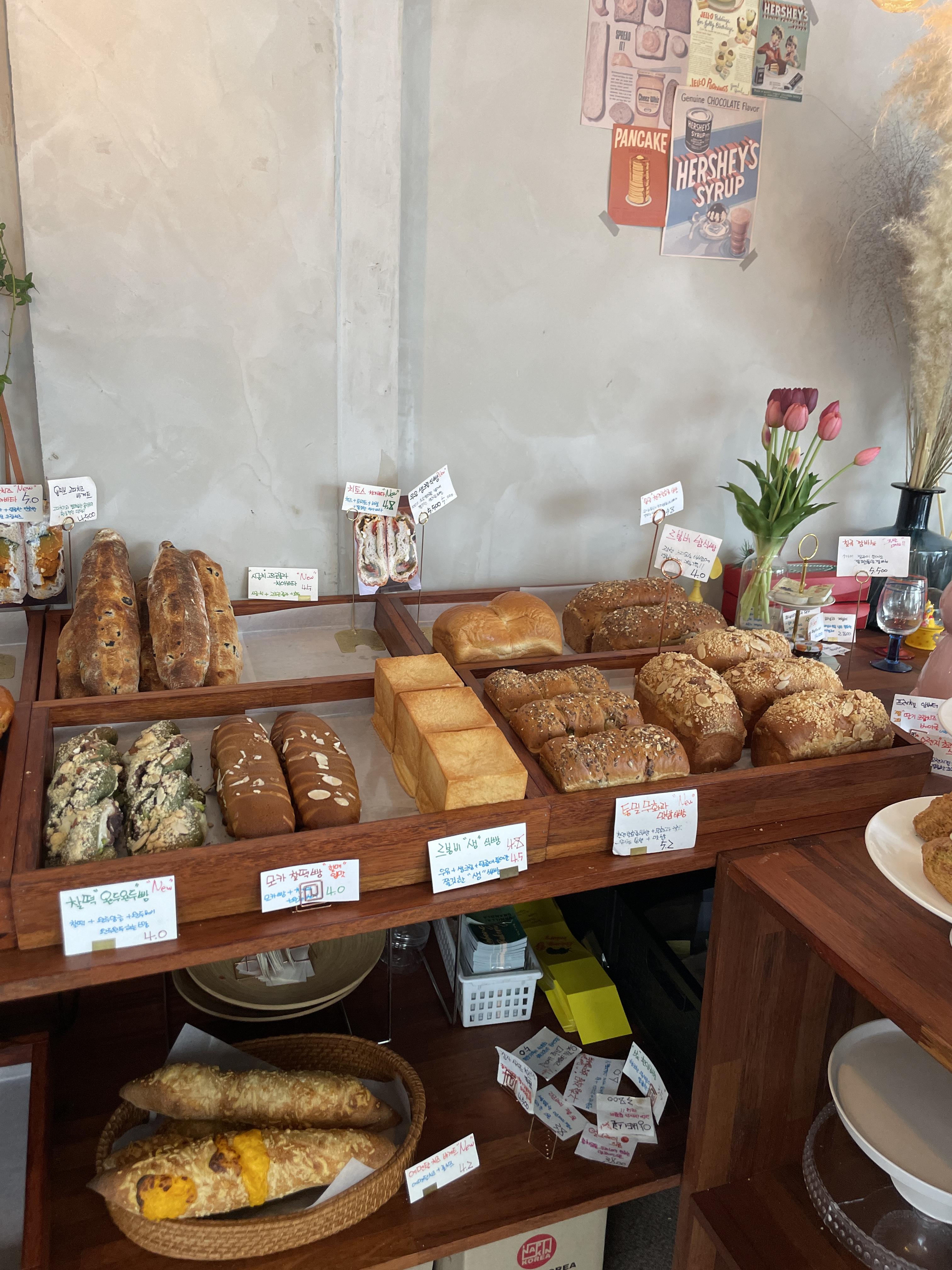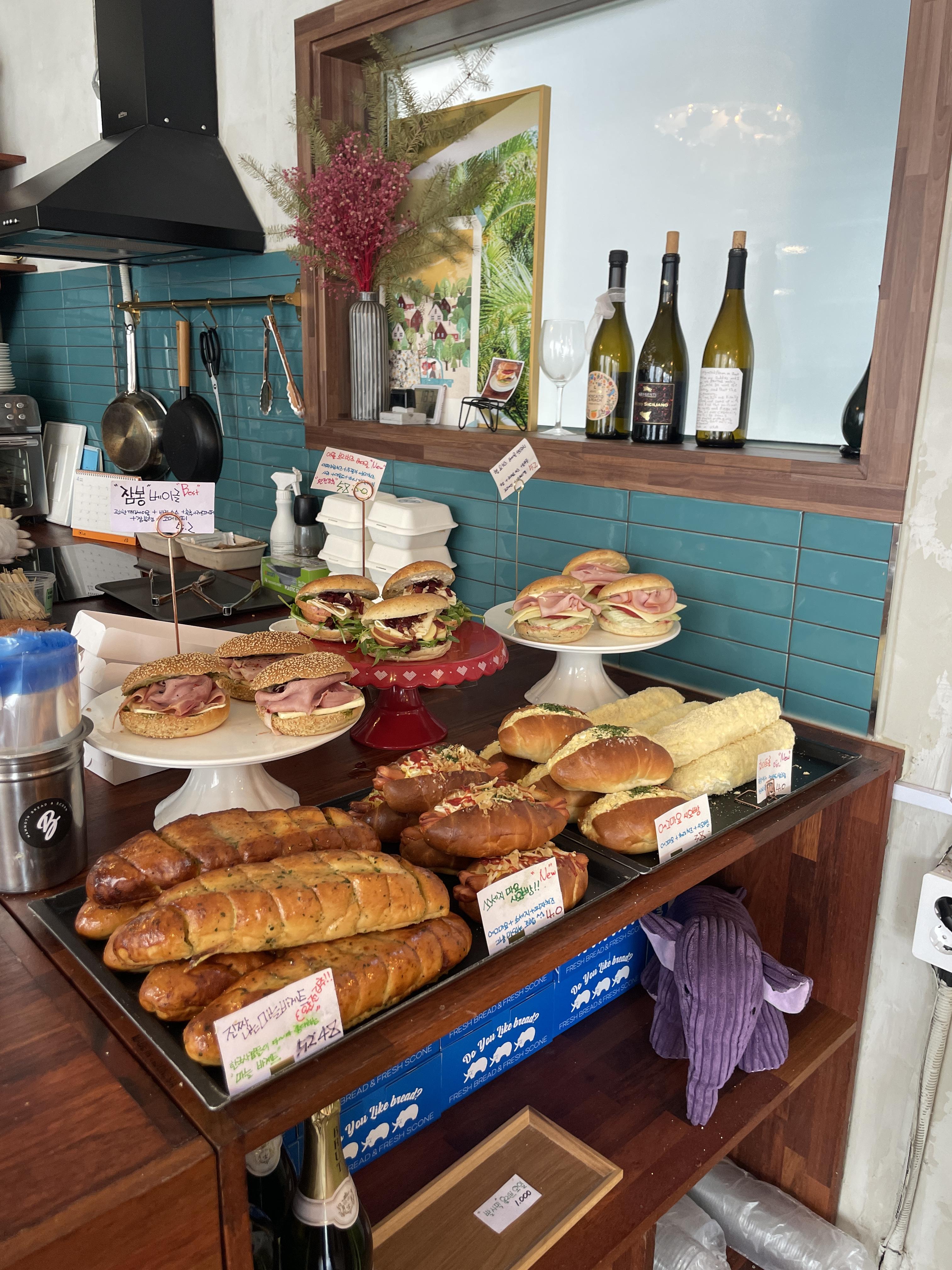 벽면을 따라 베이글, 식빵 등 다양한 종류의 빵들이 진열되어 있고, 그 끝을 따라가다 보면 카운터가 마련되어 있습니다.